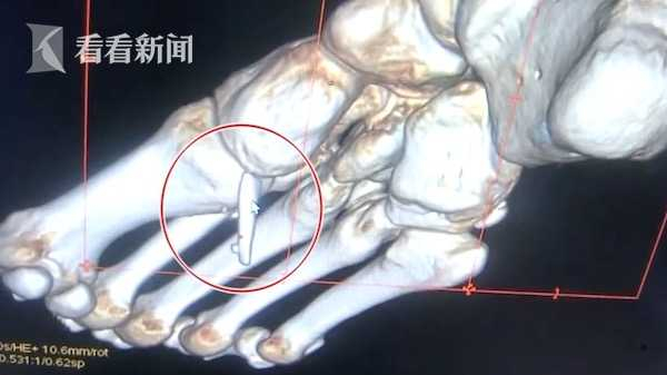 邵先生的脚受伤后做了清创缝合手术。术后一个月,伤口愈合了,但是脚依旧疼得厉害。他去医院一检查,惊讶地发现,脚里面竟然还有一块两厘米多长的玻璃碎片。