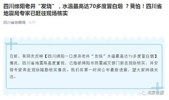 近日,有网友称四川绵阳一口废弃老井“发烧”,水温最高达70多度冒白烟。此事引发关注。