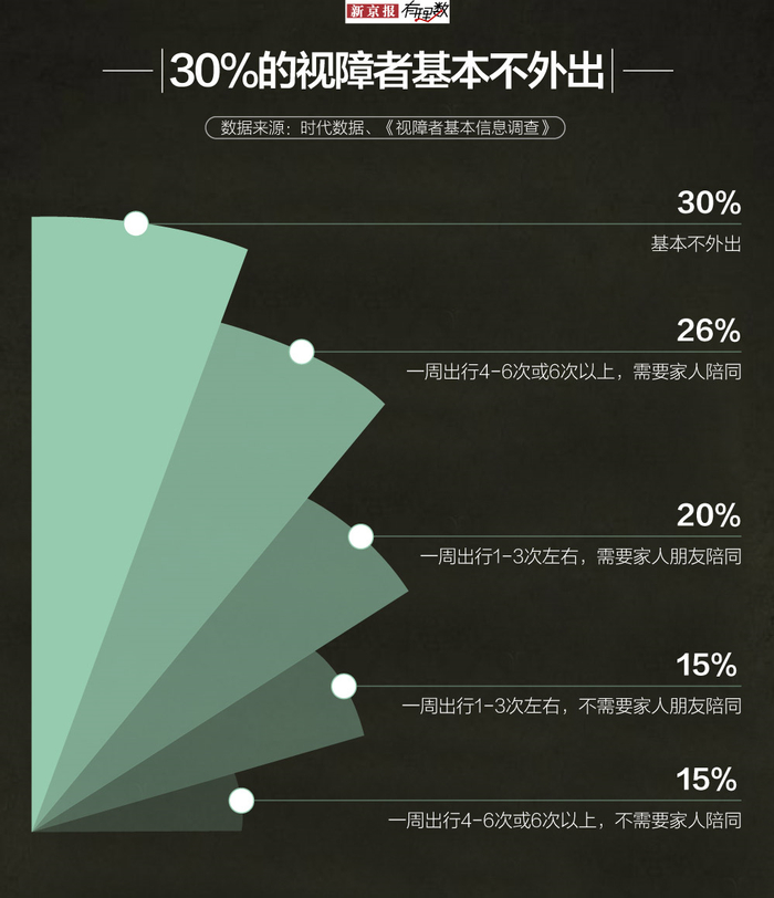 因此,待在家里不出门就成了无奈之举。据统计,有30%的视障者基本不外出,剩下的人也只能在家人有空陪同的时候每周出去几次。