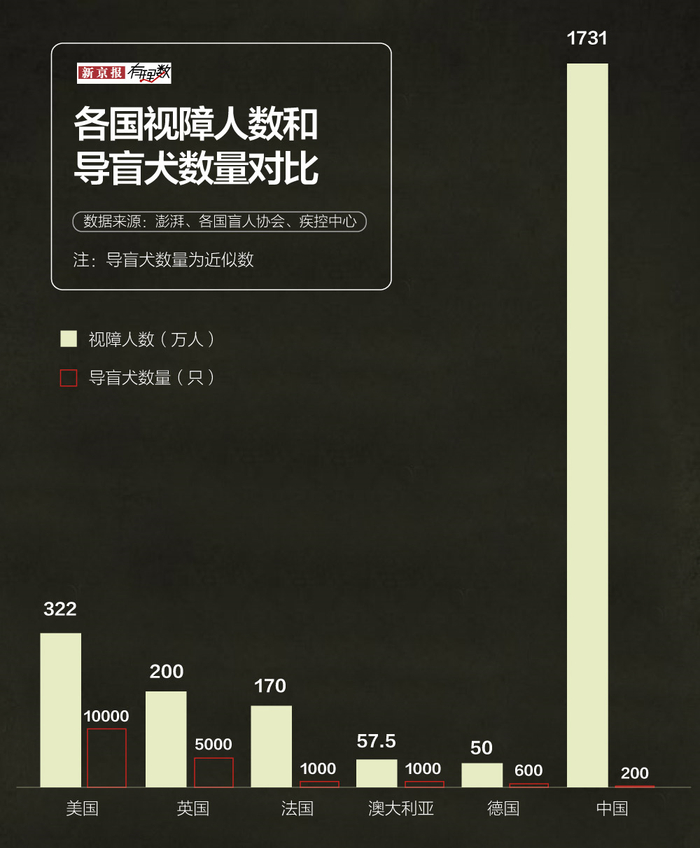 据不完全统计,全国范围内有1731万视障人士,却只有200只现服役导盲犬,比大熊猫更“稀有”,和发达国家比起来差距巨大。按照国际导盲犬联盟的标准,一个国家只有1%之上的视障者使用导盲犬时,才能称之为导盲犬的普及。按照中国1731万的视力残疾人口计算,导盲犬的数量应在17万只左右。