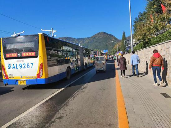 在香泉环岛组织游客安全有序乘车的首都公共文明引导员张会先向记者表示:“今天乘坐公交车的人特别多,尤其是在香山这里下车的。”在记者采访的间隙,她迅速组织疏散下车的游客,让公交车快速离开,给下一辆公交车腾位置。