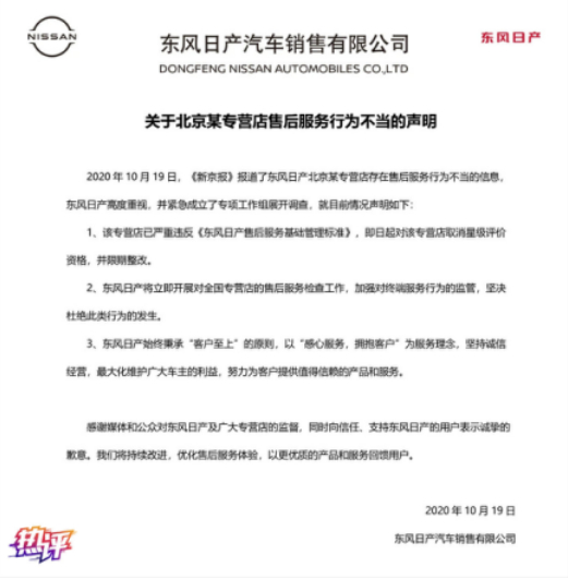 暗访报道发表后,东风日产和上汽大众都在当天做出了回应,表示已对自己旗下被曝光的4S店采取了“取消星级评价资格”和“立即停业,接受调查”等惩罚措施,并将展开对全国专营店的售后服务检查等补救工作。这样的积极态度公众当然乐见,全社会都期盼4S店的水别再“深”下去了,也别再等真的出了问题时再去追责。不违规的底线、常态化的检查、违者必究的处罚……监管部门该担的责,4S店身为企业该负的责,一样都不能少。这既是为了消费者不受损失,也是为了4S店的良性发展,对于整个社会诚信经营、诚信消费观的建立,也都非常重要。