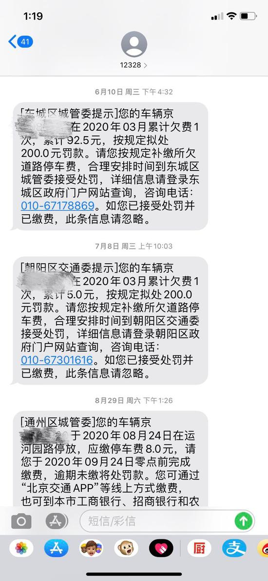按照罚款短信中提供的联系方式,徐女士拨通了昌平区城管委的热线电话,反映从未收到催缴短信的情况。接线员回复说,的确有可能因为手机拦截、网络信号不好以及运营商问题,导致车主收不到短信,“但是短信提醒只是一项辅助功能,不能成为影响您及时缴费和欠费处罚的因素。”