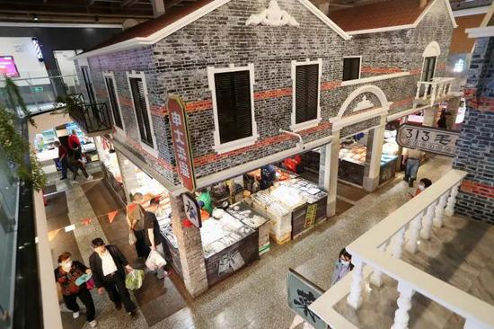 走进菜场,奚阿姨边走边跟记者讲自己喜欢的理由:“一个摊位一堵墙,老早的石库门门洞样式,不像是到菜市场买菜,倒是像在‘老上海风情街’。”“苦林雪花膏”“利安百货”“东方表行”“白兰地”……在石库门风格的摊位中央,老式广告牌错落有致,间或还能看到红色电话亭、旗袍等上海元素。比起传统印象里熙熙攘攘的菜场,这里更像一个颇有怀旧意味的“老街”。