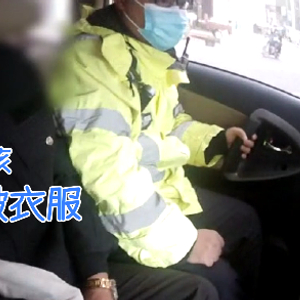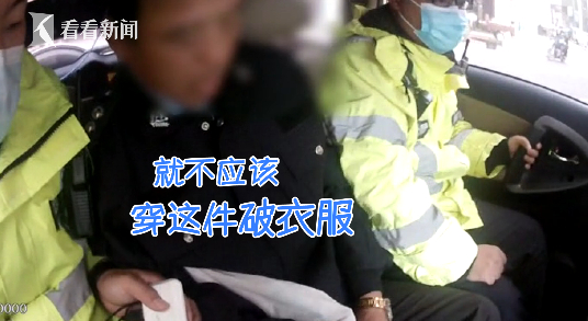 坐在警车后排中间,穿着警服的一位“交警”,不断发出抱怨:“唉,就不应该戴这个帽子!就不应该穿这件破衣服!我白花这个倒霉钱。”