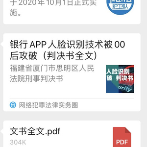 我在小区两个业主群中发了人脸识别风险性相关的报道和法律依据,包括福建省厦门市银行APP人脸识别技术被“00后”攻破、及浙江省衢州市张某等人侵犯公民个人信息罪的刑事判决书、新版《信息安全技术 个人信息安全规范》等材料。《个人信息安全规范》规定,收集人脸信息需要单独告知并获得个人信息主体的授权同意,且不得存储原始图像。