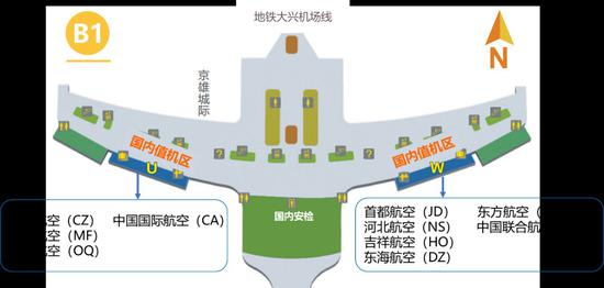 大兴机场地下一层设有全部国内航班值机柜台及安检通道,通过地铁大兴机场线或者京雄城际高铁到达且乘坐国内航班的旅客,可就近直接在地下一层办理值机手续,并通过安全检查和登机。其中,U岛为国航、南航、厦航、重庆航值机区,W岛为东航、中联航、河北航、首都航、吉祥航、东海航值机区。