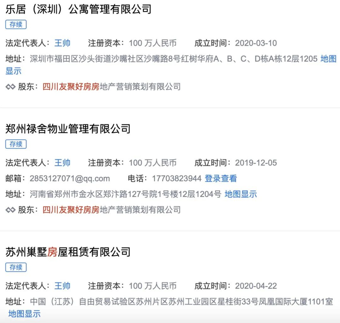 以友聚好房为例,他们一边以疫情影响为由,关闭早期开拓的城市业务,另一边在二线城市重新“开辟疆土”。据启信宝,友聚好房成立于去年10月,其旗下经营的多家公司成立时间均在疫情爆发后。