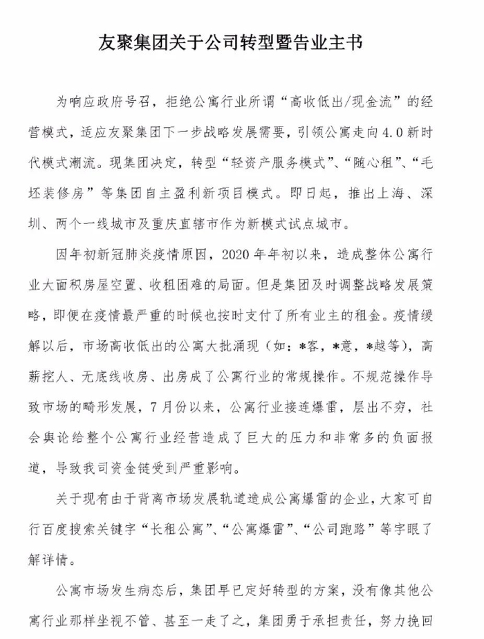 从受访者提供的资料来看,友聚好房在重庆、上海等地的操作,跟深圳几乎是一样的配方,一样的味道——国庆前两天以集团名义向外发布转型通知,缓发员工工资和业主房租,随后趁国庆长假跑路,等假期后人们意识到问题时,公寓方已人去楼空,“快闪”到连个面对面讨论解决方案的机会都没给。
