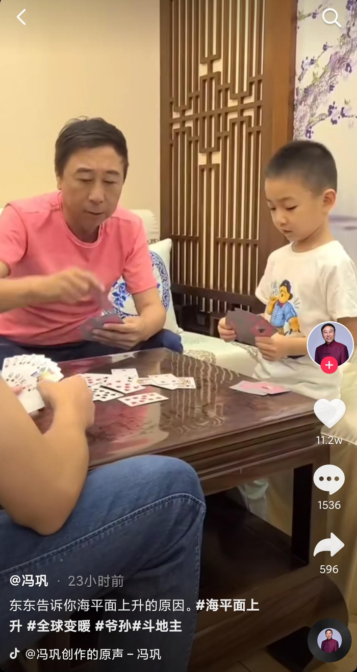 不难看出,在冯巩发布的这些视频里,“斗地主”和吃饭一样,其实更像是一个教育场景或载体,不过是想借此告诉孙子一些道理、生活常识或科学知识。孩子的机智对话以及冯巩作为相声演员特有的“抖包袱”,常常会让视频产生一种莫名的喜感,如果只注意到像段子一样的笑料,显然对视频的实质内容理解不足。同样,当个别网友质疑其斗地主的教育方式存在问题时,就像写作文跑题了一样,没抓到重点。