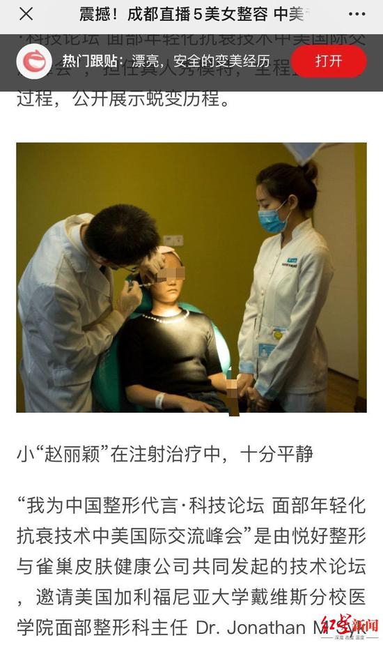 红星新闻记者查询到,2017年4月17日,曾有媒体刊发《震撼!成都直播5美女整容 中美专家联手造小“赵丽颖”》的新闻,新闻中写道:“2017年4月15日,成都一名长相几分酷似赵丽颖的女子——素素,在一家整形医院接受整形美容手术……素素接受了玻尿酸全面部注射精雕……由悦好整形院长注射,共填充玻尿酸5ml。”而文中名为“素素”的女子,即宁女士。
