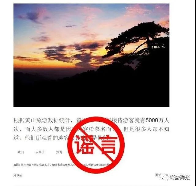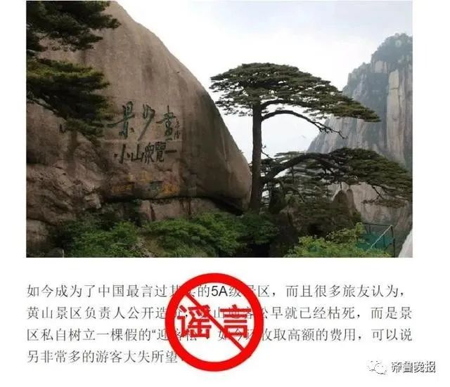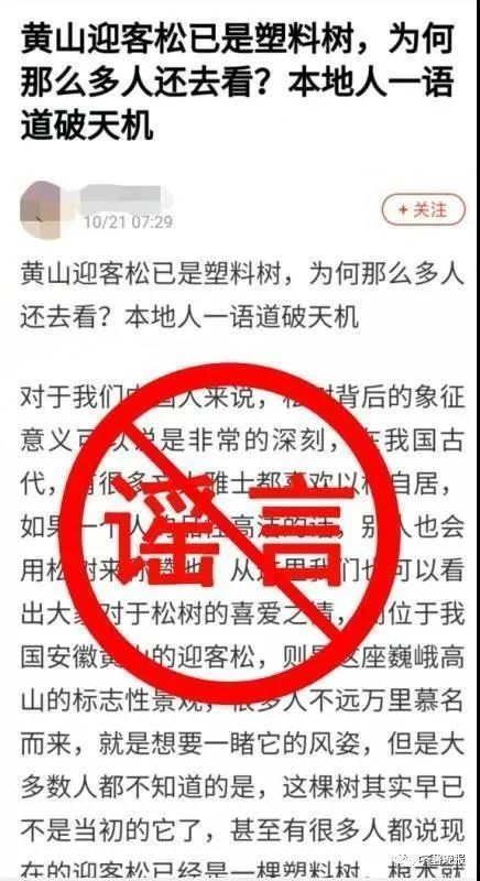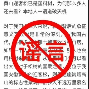 炮兵老三 : 我估计谣言是这么来的:1、今天我去黄山,看到迎客松上挂了个塑料袋。2、我朋友去黄山,说迎客松上有塑料,3、我朋友说他去黄山,迎客松是塑料的。