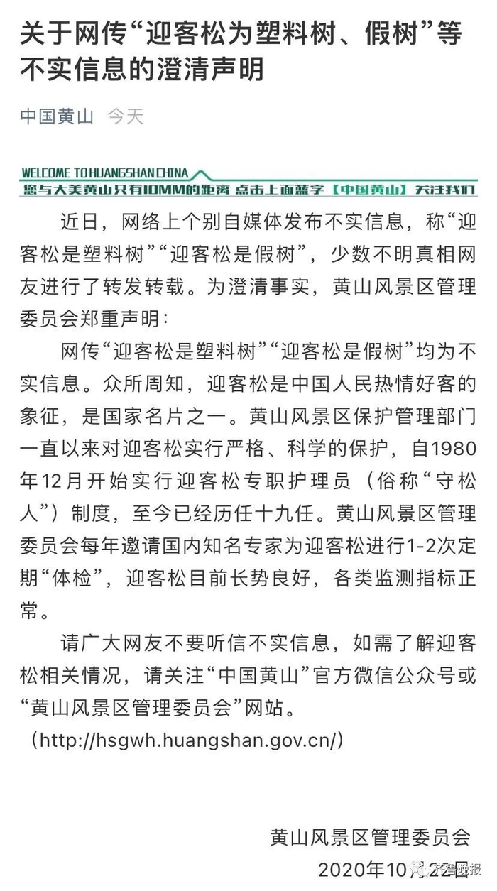 网传“迎客松是塑料树”“迎客松是假树”均为不实信息。众所周知,迎客松是中国人民热情好客的象征,是国家名片之一。黄山风景区保护管理部门一直以来对迎客松实行严格、科学的保护,自1980年12月开始实行迎客松专职护理员(俗称“守松人”)制度,至今已经历任十九任。黄山风景区管理委员会每年邀请国内知名专家为迎客松进行1-2次定期“体检”,迎客松目前长势良好,各类监测指标正常。