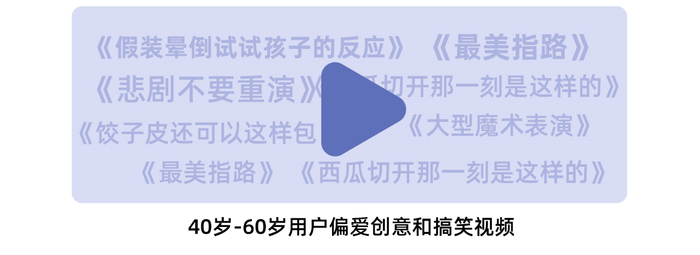 与之作为对比的是,40岁的中年人更爱创意和搞笑内容,“社会”、“反常”、“生活技巧”等关键词的小视频更受他们欢迎。