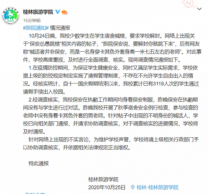 据桂林旅游学院官方微博10月25日消息,10月24日晚,桂林旅游学院少数学生在学生宿舍喊楼,要求学校解封。网络上出现关于“保安怂恿跳楼”相关内容的帖子,“旅院保安说,要解封你就跳下来”,后有网友称“喊话者并非保安,而是一名身穿卡其色外套身高一米七五左右的老师”。对此事件,学校高度重视,及时进行全面调查、核实。现将调查情况通报如下。