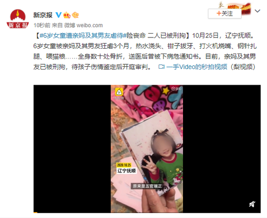 10月25日,辽宁抚顺。6岁女童被亲妈及其男友狂虐3个月,热水浇头、钳子拔牙、打火机烧嘴、钢针扎腿、喂猫粮……全身数十处骨折,送医后曾被下病危通知书。目前,亲妈及其男友已被刑拘,待孩子伤情鉴定后开庭审判。
