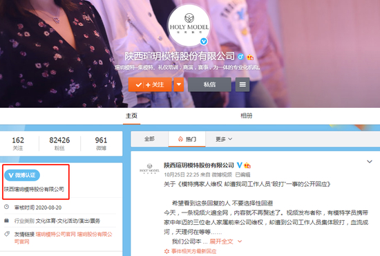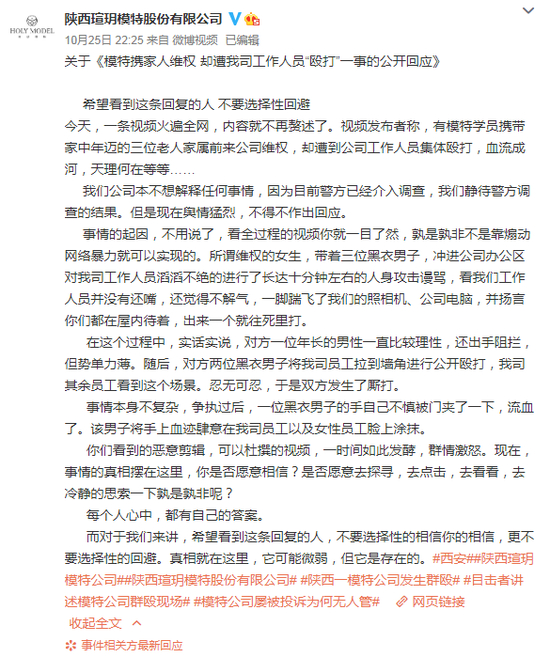 而就在10月25日晚,微博认证的“陕西瑄玥股份有限公司”发文就“殴打”事件作出回应: