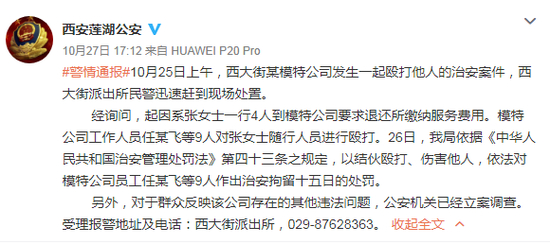 10月27日下午,西安莲湖公安发布的警情通知,除了对双方纠纷一事发布通报,通报中写道:模特公司工作人员任某飞等9人对张女士随行人员进行殴打,被行政拘留十五日。
