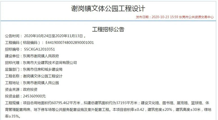 招标文件显示,谢岗镇文体公园工程项目投资金额为245360900元,总用地面积约60795.462平方米(约91亩),拟建总建筑面积约为37193平方米,新建设文化馆、图书馆、展览馆、篮球馆、体育管理配套用房、地下停车场等公共服务配套设施及室外配套工程。项目容积率≤0.42,建筑密度≤20%,建筑高度≤30米,绿地率≥35%。其中,图书馆按中型公共图书馆服务人口20万-50万规模设计,而篮球馆、文化馆和展览馆按小型规模设计。