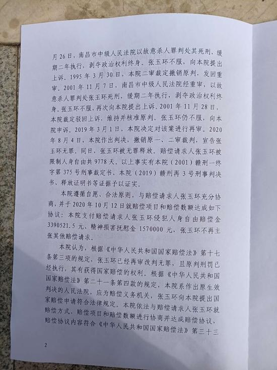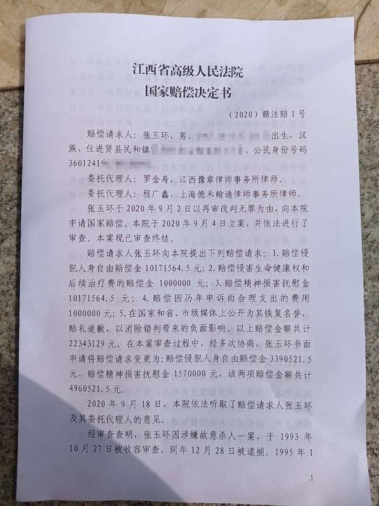 该决定书显示,在自愿协商的基础上,江西高院与张玉环达成国家赔偿协议:向张玉环支付国家赔偿金共计4960521.5元,包括无罪羁押9778天人身自由赔偿金3390521.5元和精神损害抚慰金157万元。