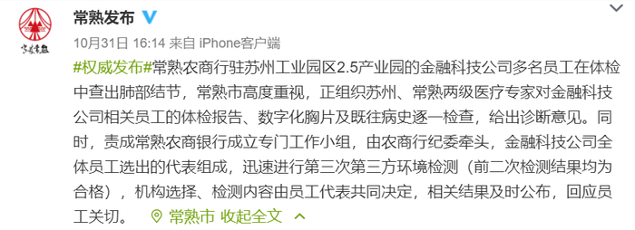 10月31日,江苏省常熟市委外宣办、常熟市政府新闻办官方回应,称正组织苏州、常熟两级医疗专家对金融科技公司相关员工的体检报告、数字化胸片及既往病史逐一检查,给出诊断意见。同时组织第三次第三方环境检测,及时公布结果,回应员工关切。