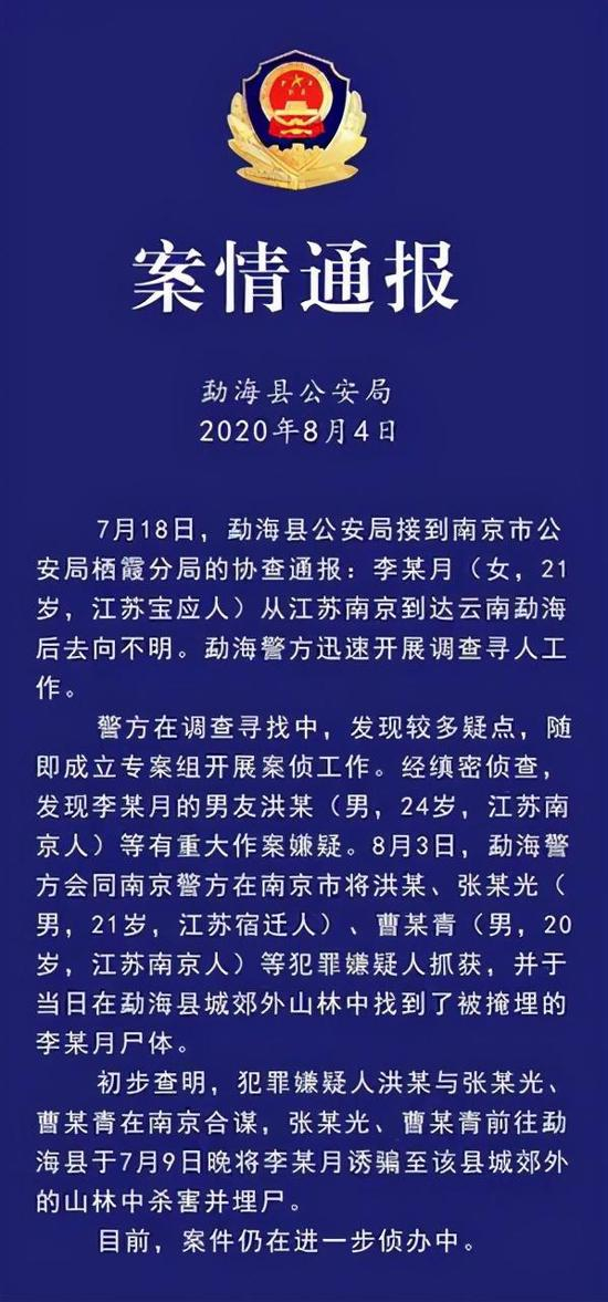 8月4日云南省西双版纳州勐海县公安局初步查明,犯罪嫌疑人洪某与张某光、曹某青在南京合谋杀人,张某光、曹某青前往勐海县于7月9日晚将李倩月诱骗至该县城郊外的山林中杀害并埋尸。