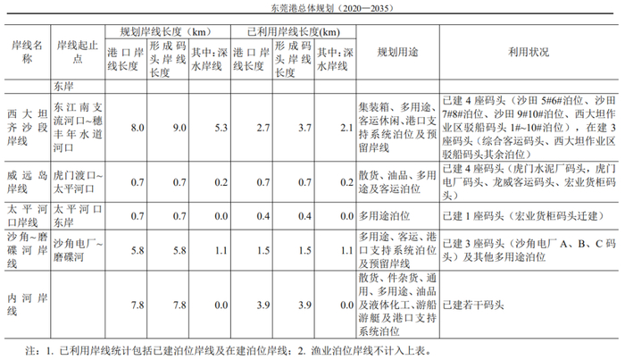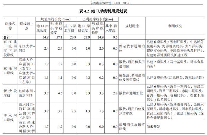 东莞港共规划港口岸线54.8km,其中已利用港口岸线23.9km、新增港口岸线20.9km、预留港口岸线10.0km,可形成码头岸线57.1km,其中深水岸线20.9km。规划建议,协调港城关系,保障港口发展空间;适当提高主航道的等级,为东莞港进一步发挥深水岸线资源潜力,适应到港船型大型化提供支持;加快港口锚地的规划与建设工作, 为港口正常营运提供保障;加快改善港区通航环境,进一步加强水上安全和应急能力建设, 提高港口运营效率和安全保障能力。