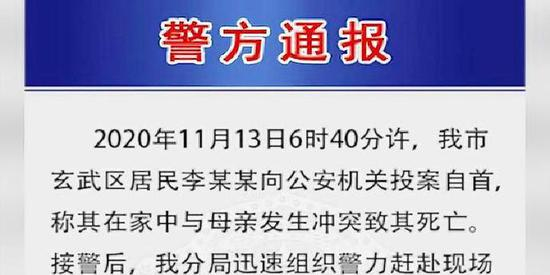 11月16日13时23分,玄武警方在其官方微博“南京玄武警方在线”发布通报:11月13日6时40分许,我市玄武区居民李某某向公安机关投案自首,称其在家中与母亲发生冲突致其死亡。接警后,我分局迅速组织警力赶赴现场调查处置。