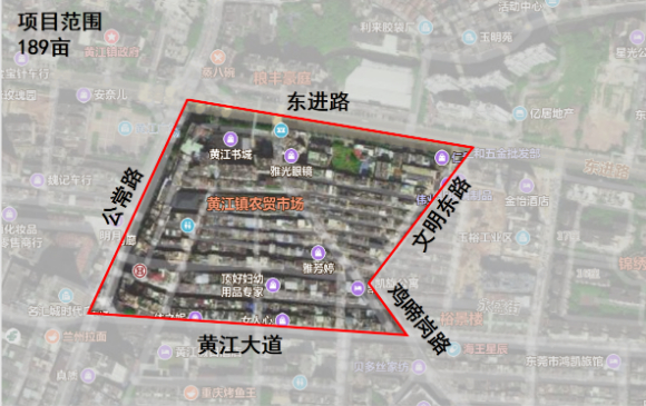 该更新项目位于东莞市黄江镇中心区,北临东进路,东至公常路,南靠黄江大道,西至文明东路转鸡啼岗路,拟更新单元范围总面积约12.6公顷(189亩)。实际用地面积、界限均以政府相关部门批复的文件为准。中标单位对宗地块范围开展前期服务工作。