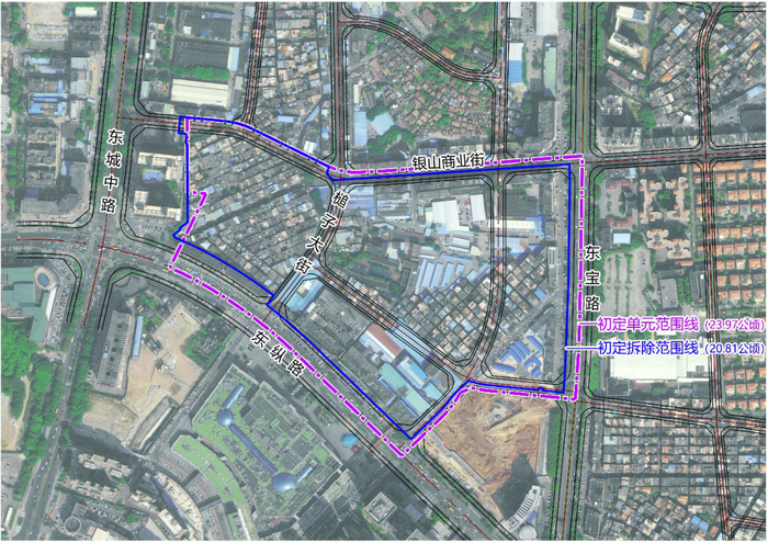 东莞市东城街道主山社区主山村南侧更新单元位于主山社区主山村,东至东宝路、南至东纵路及泰和新天地、西至花样年华、北至银山商业街,占地面积约为23.97公顷(约360亩),实际用地面积、界线最终以测绘或政府相关部门审批为准。经初步摸查,单元拟拆除范围内集体土地约16.17公顷,基本属主山合作社所有(相关权属情况以最终权属调查结果为准)。