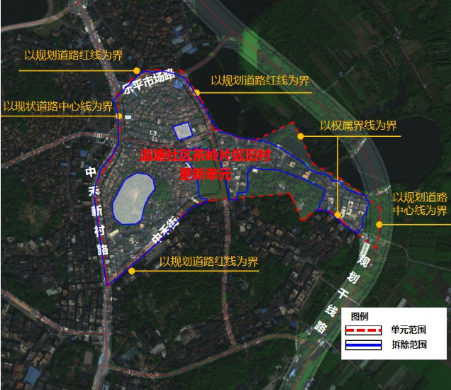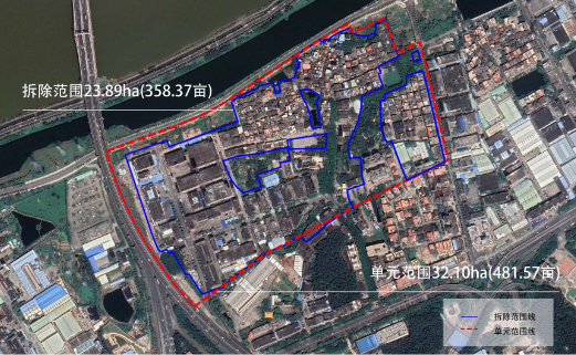 该单元位于东莞东城街道茶岭片区旧村,北至乐平市场路,南至中禾街,东至规划纵路、规划干线路,西至中禾新村路,占地面积约12.23公顷(184亩),实际用地面积、界线最终以测绘或政府相关部门审批为准。