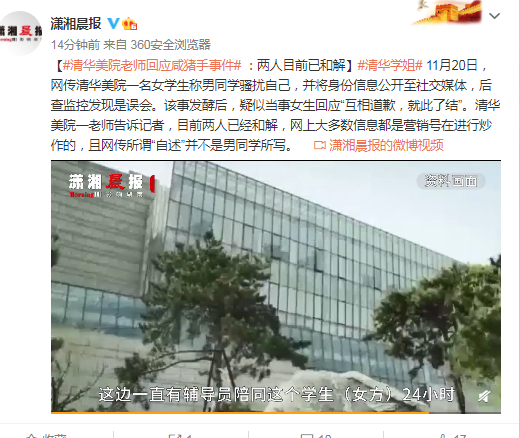 11月20日,网传清华美院一名女学生称男同学骚扰自己,并将身份信息公开至社交媒体,后查监控发现是误会。该事发酵后,疑似当事女生回应“互相道歉,就此了结”。清华美院一老师告诉记者,目前两人已经和解,网上大多数信息都是营销号在进行炒作的,且网传所谓“自述”并不是男同学所写。