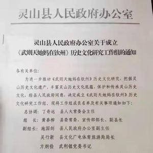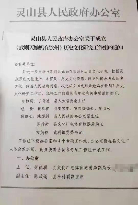 “武则天她妈在钦州”红了。近日,一份题为《灵山县人民政府办公室关于成立<武则天她妈在钦州>历史文化研究工作组的通知》的红头文件传出。文件称,为进一步推动《武则天她妈在钦州》历史文化研究,挖掘灵山历史文化遗产,丰富灵山历史文化底蕴,保护和传承灵山历史文化,经县人民政府同意,决定成立《武则天她妈在钦州》历史文化研究工作组。