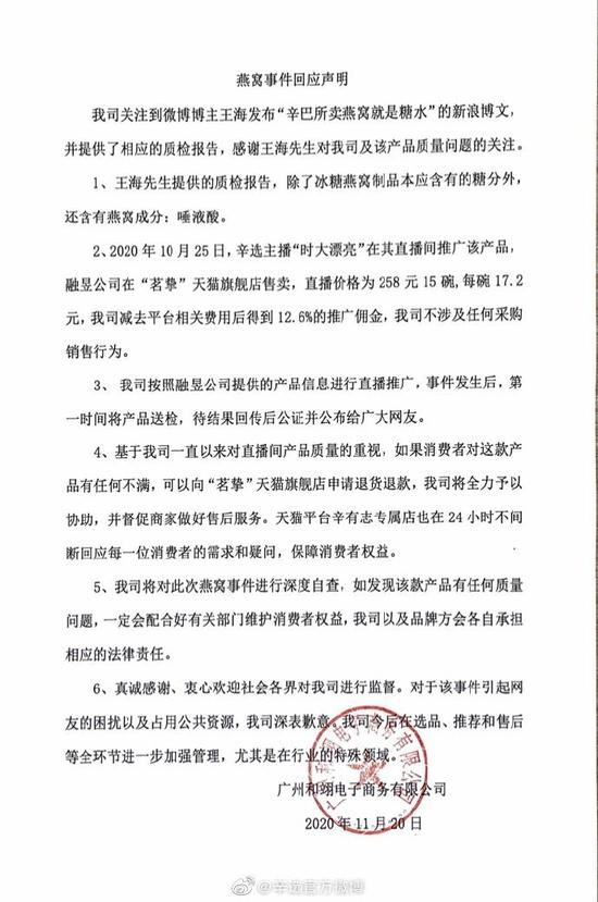 针对辛巴(快手主播)所售燕窝被检测为糖水一事,11月20日早间,辛选官方微博进行回应,称职业打假人、微博认证为“知名法律博主”的王海提供的质检报告中,除了冰糖燕窝制品本应含有的糖分外,还含有燕窝成分:唾液酸。事件发生后,第一时间将产品送检,待结果回传后公证并公布给广大网友。