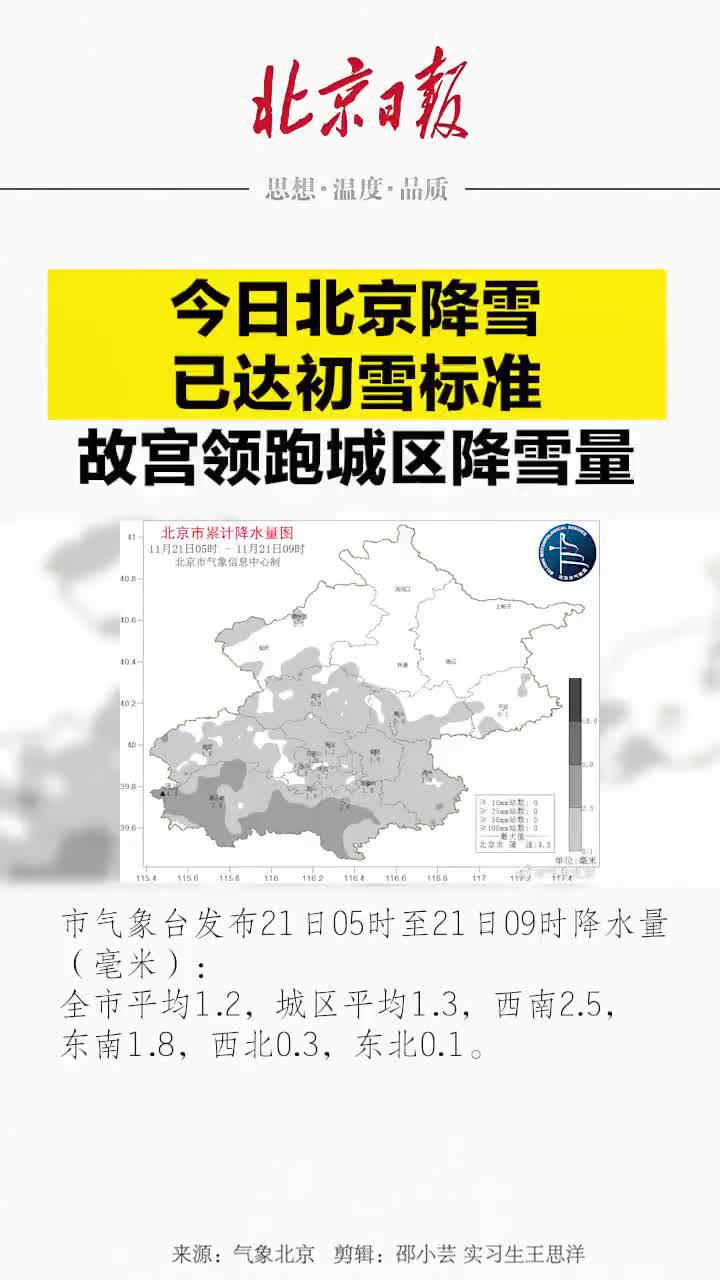 今日北京降雪已达初雪标准 故宫领跑城区降雪量