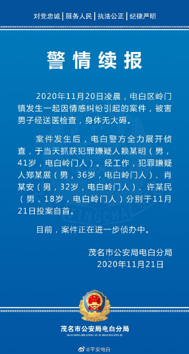 经工作,犯罪嫌疑人郑某展(男,36岁,电白岭门人)、肖某安(男,32岁,电白岭门人)、许某民(男,18岁,电白岭门人)分别于11月21日投案自首。目前,案件正在进一步侦办中。