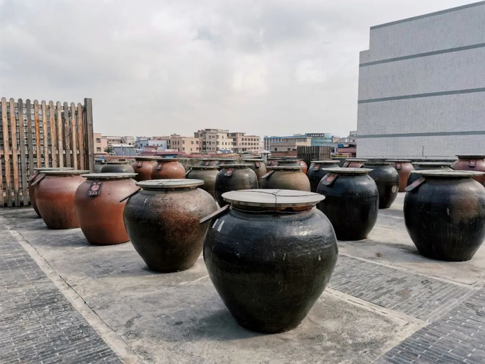 在食品厂的天台上,除了腊肠,还静静地摆放着十几口大缸。不用往里看,光闻味道就知道这些大缸里装的都是酱油。有的酱缸已经晒够了时间出了油,浓浓的酱油香隔着厚厚的玻璃往鼻子里钻。
