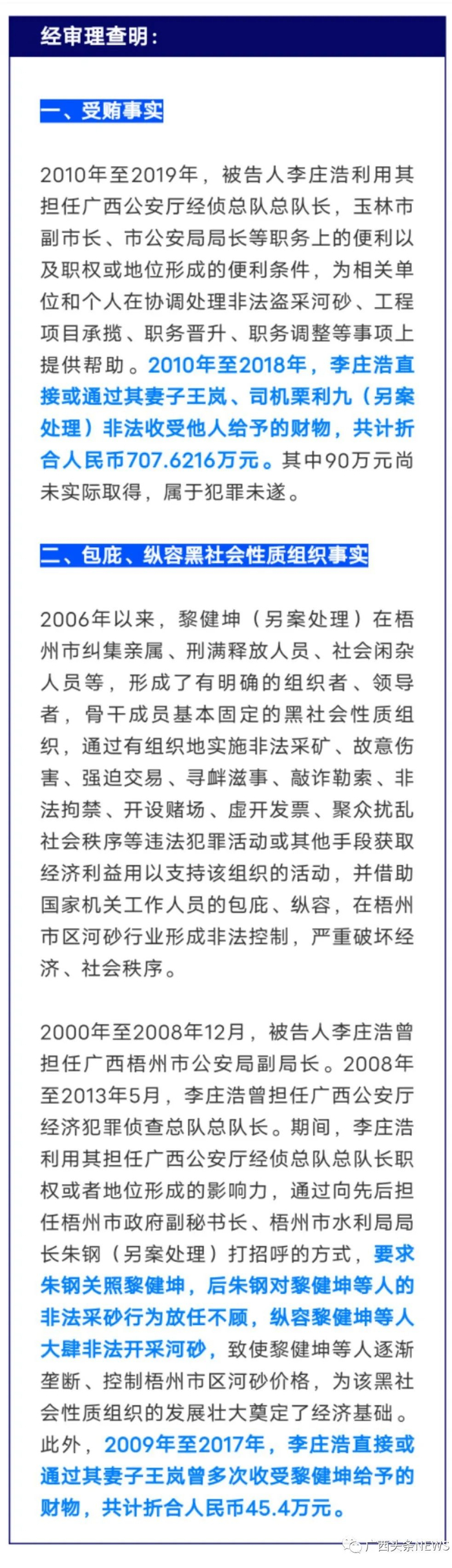 11月24日上午,南宁市中院对广西玉林市原副市长、公安局局长李庄浩受贿,包庇、纵容黑社会性质组织案进行一审宣判。以受贿罪,包庇、纵容黑社会性质组织罪,数罪并罚,对被告人李庄浩决定执行有期徒刑十一年六个月,并处罚金人民币六十万元。