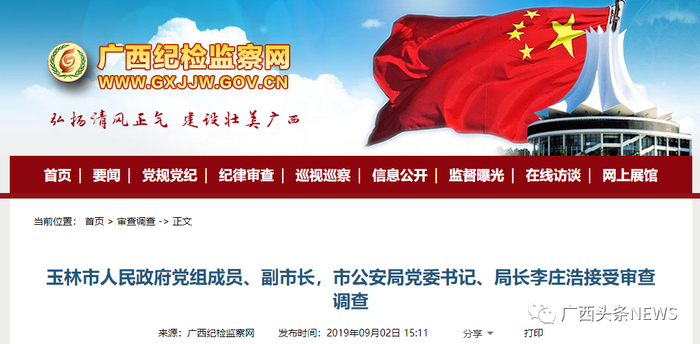 2019年9月2日,广西纪检监察网通报:玉林市人民政府党组成员、副市长,市公安局党委书记、局长李庄浩,因涉嫌严重违纪违法,目前正接受广西壮族自治区纪委监委纪律审查和监察调查。