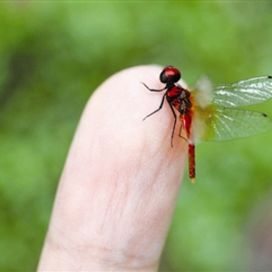 红色的躯干、透明的翅膀、又大又鼓的眼睛,除此之外,成都华希昆虫博物馆里这些蜻蜓标本还有一个特别之处,就是特别短小——雄性平均体长仅仅16.5毫米,雌性16毫米,最小的雄性不足15毫米。如果把这只不足15毫米的蜻蜓放在手指上比划一番,可以发现它的长度和指甲盖差不多。要知道,就躯干长度而言,最修长的种类卢克丽霞巨豆娘的躯干长度可达15.5厘米!