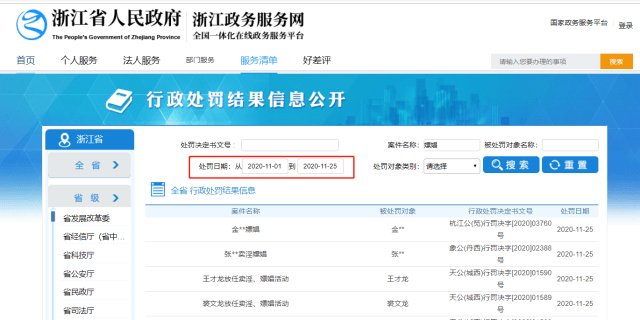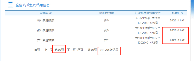 按照网友提供的方法,记者用时间段检索的方式进行搜索11月的处罚记录,发现一共有60页,1006条记录。