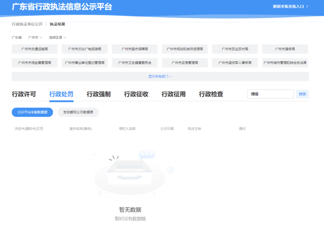 那么,除了浙江省外,其他省份有没有公布和嫖娼相关的行政执法的结果呢?记者登录广东政务服务网进行关键词搜索,搜索结果显示暂时没有数据。