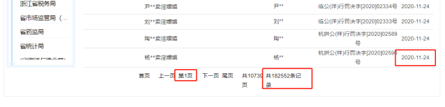 根据该帖子的搜索步骤,记者在浙江政务服务网上用关键词“嫖娼”进行了搜索,发现该网页末尾确实如帖子所述,显示共有 10739页,有 182552条案件记录。在第一页的案件处罚时间显示为 2020年11月25日。