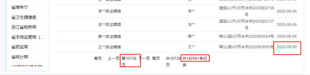然后点击[尾页]进入案件记录的最后一页,发现显示的处罚时间为2020年8月9日,因此该发帖人得出了浙江近三个月查处了18万多人的结论。