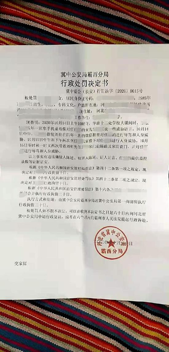 汪文月向记者提供了两份《冀中公安局霸西分局行政处罚决定书》。在编号为冀中霸公(长安)行罚决字(2020)0014号中,称汪文月因其触犯《治安管理处罚法》地二三十条第一款第一项之规定,对其行政拘留10日。事由是10月26日14时许,朱某(任某女儿)正在学校操场上体育课,汪文月带其儿子顾明来到朱某身前,双手抓住朱某的双肩让其儿子顾明打朱某,造成教学秩序无法正常开展。
