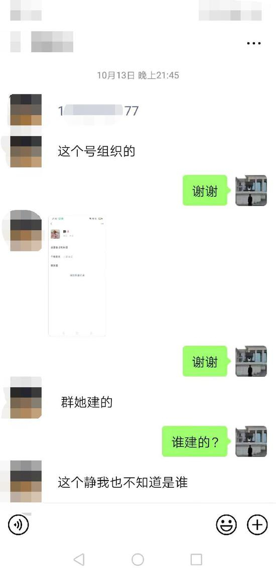 另一位家长则私信她,说有一位家长建了个群来声讨她,并号召家长到学校来闹事。该家长提供了建群者的手机号及微信昵称,并说在群里声讨她时,因一位家长看不下去,替她说了几句公道话,就被踢出了新建的群。根据昵称及手机号,汪文月判断带头建群的家长就是任某。