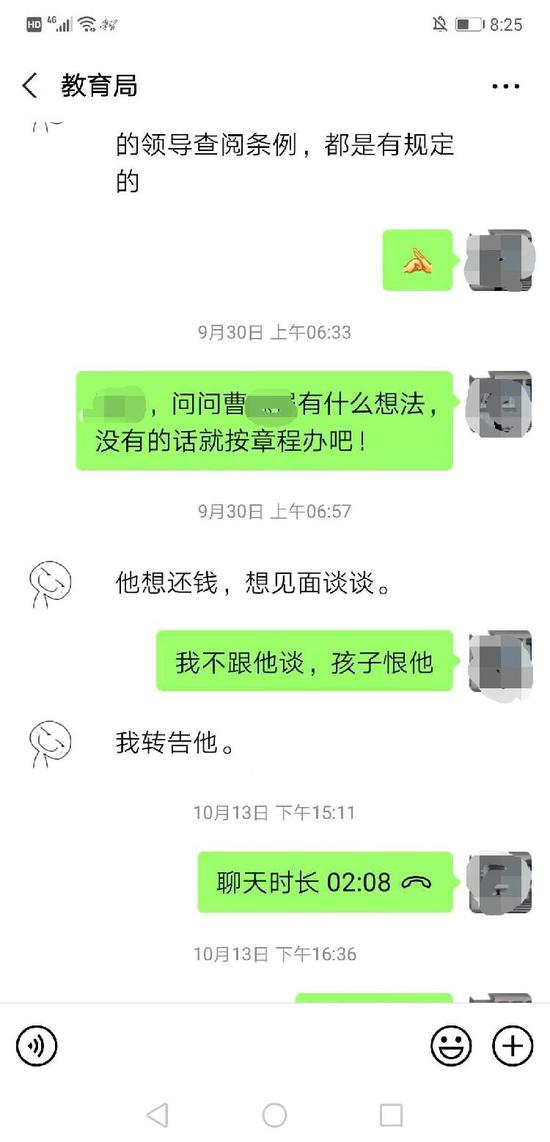 第二天,调查人员向她反馈:她的举报属实,曹老师自己也承认了,并询问她有什么可以解决的办法没有。汪文月说,直到此时,她都没有想到处分曹老师的事儿。在她看来,曹老师既是他的老师,又有教学能力,她委婉地表达了道个歉就算了。他还问曹老师自己想怎么办,调查人员说“曹老师想还钱,并想跟你见面谈谈”。上述相关微信对话记录,她做了截屏。