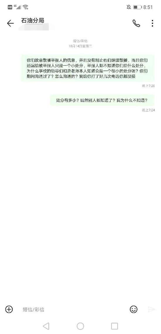 13日当天,汪文月便打电话给孟校长和沧州市教育局石油分局相关调查人员,双方都否认是他们泄露了她的举报者身份。次日,她见到孟校长时,再次询问此事,孟校长开着语音联系了沧州市教育局石油分局基础教育科的张科长。张科长说,曹老师犯的错误他们已经调查清楚,他们肯定会给予处分;如果对处分不满意,还可以向上级反映。至于谁泄露了举报人的信息,跟他们没有关系。