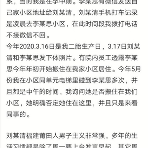 王女士说,从去年下半年开始,她就发现丈夫与同医院治疗室组长李女士疑似存在不正当男女关系,“当时我是在孕中期,(李)有微信发送自己家小区地址给(刘),他的手机打车记录是凌晨去李所在的小区,这个时间段我打电话不接,微信不回。”