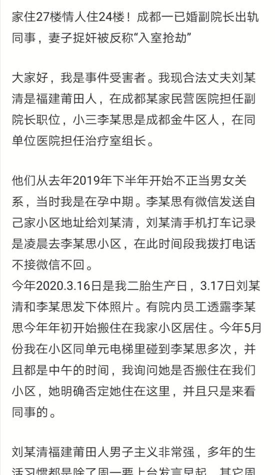 “他跟这个女的有关系,(女的)住24楼,我家在27楼,我很崩溃。”近日,成都市民王女士在网上发帖,引发全网关注。该网文称,其任职成都某民营医院副院长的丈夫刘先生在婚姻存续期间,出轨本院女同事李女士,并为李女士租房到自家楼下。